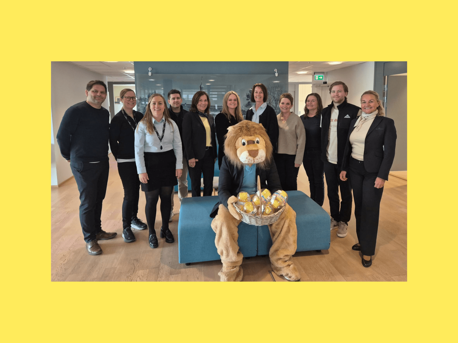 Bilde av bankløven Leo og ansatte Ørland Sparebank